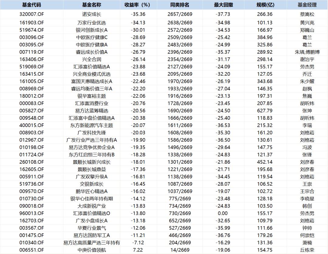在疫情挥之不去、消费投资缺乏动力的2022年,股市也表现不佳。且看这些年内大幅回撤的基金里,除了上述两位,不乏谢治宇、胡昕炜、刘格菘、王宗合、萧楠、丘栋荣等顶流基金经理的身影。