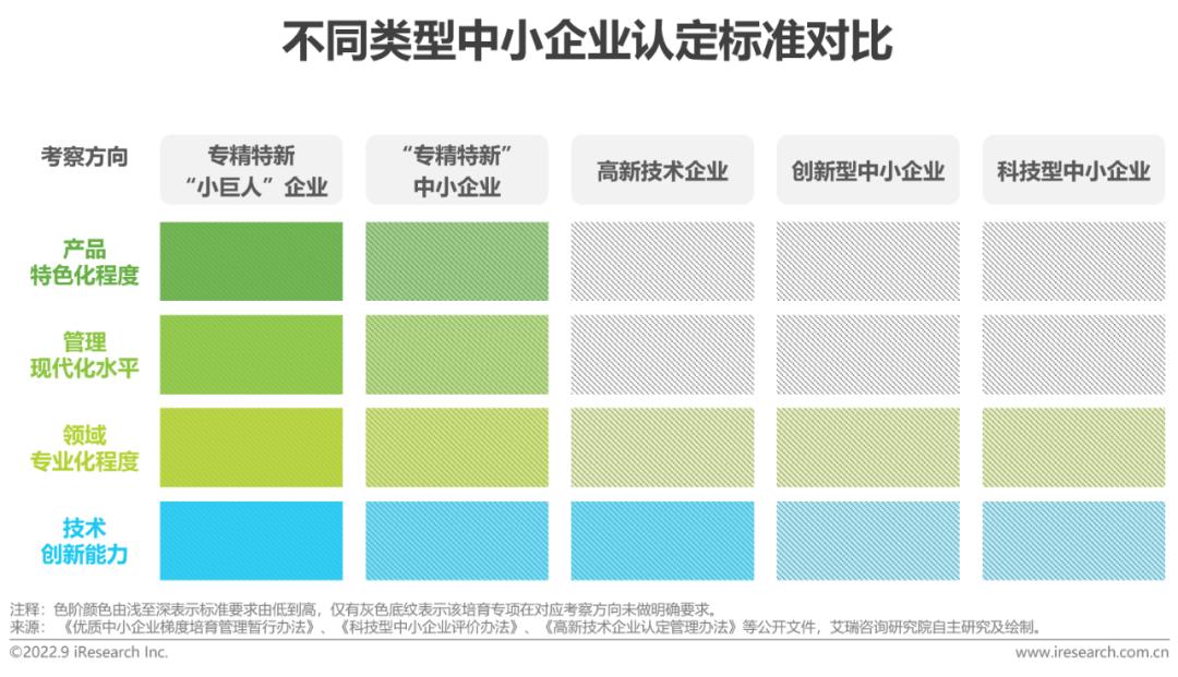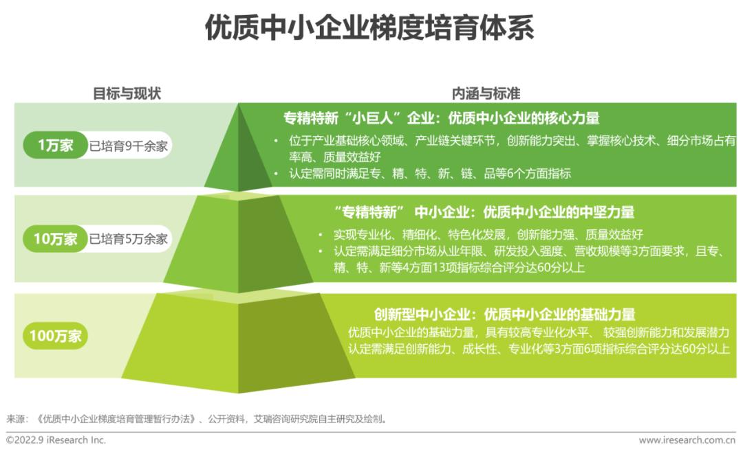 为提升中小企业创新能力和专业化水平,促进中小企业高质量发展,助力实现产业基础高级化和产业链现代化,工信部于2022年6月印发《优质中小企业梯度培育管理暂行办法》,明确优质中小企业是指在产品、技术、管理、模式等方面创新能力强、专注细分市场、成长性好的中小企业,提出构建包含创新型中小企业、“专精特新” 中小企业和专精特新“小巨人”企业3个层次的优质中小企业梯度培育体系。