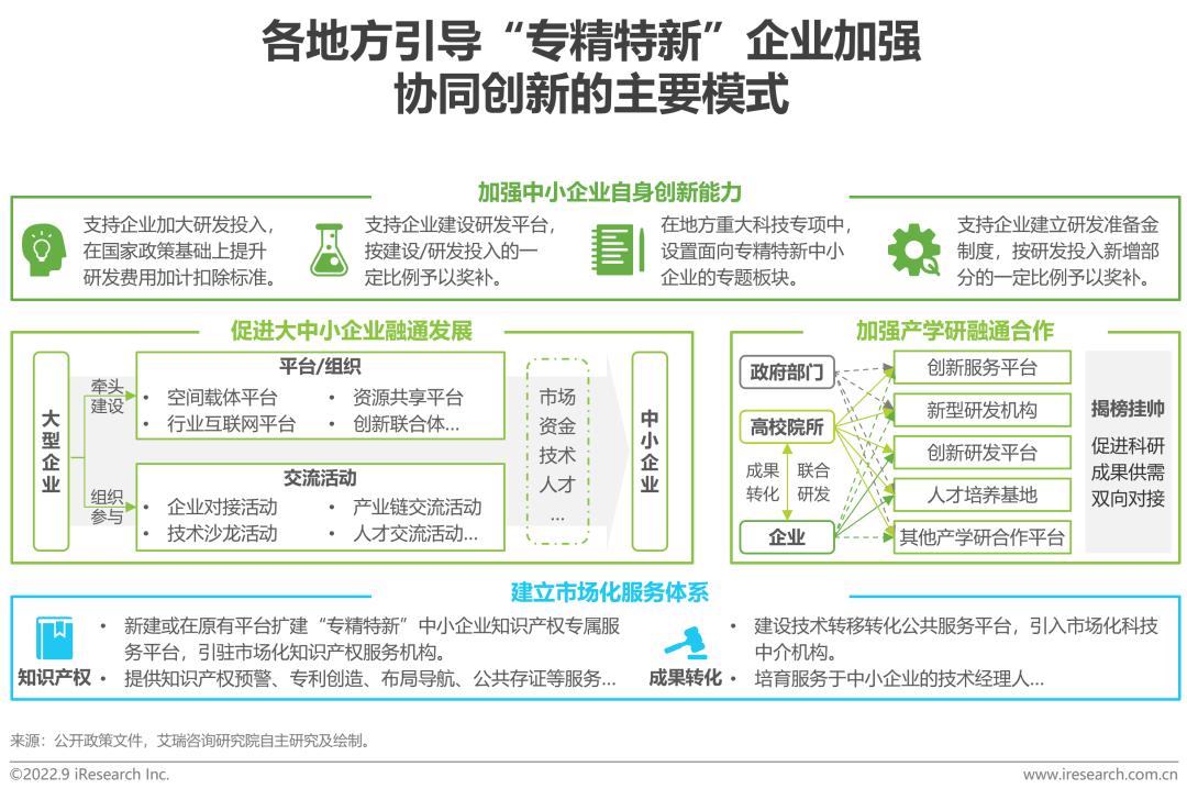 在加强“专精特新”企业协同创新方面,各地区多以政府引导为主,从加强中小企业自身创新能力、企业间协同合作、产学研合作3个方面,推动产业链与创新链融合发展。同时,引入专业化知识产权等科技服务机构为中小企业、大型企业、科研院所等创新主体提供专业化服务。