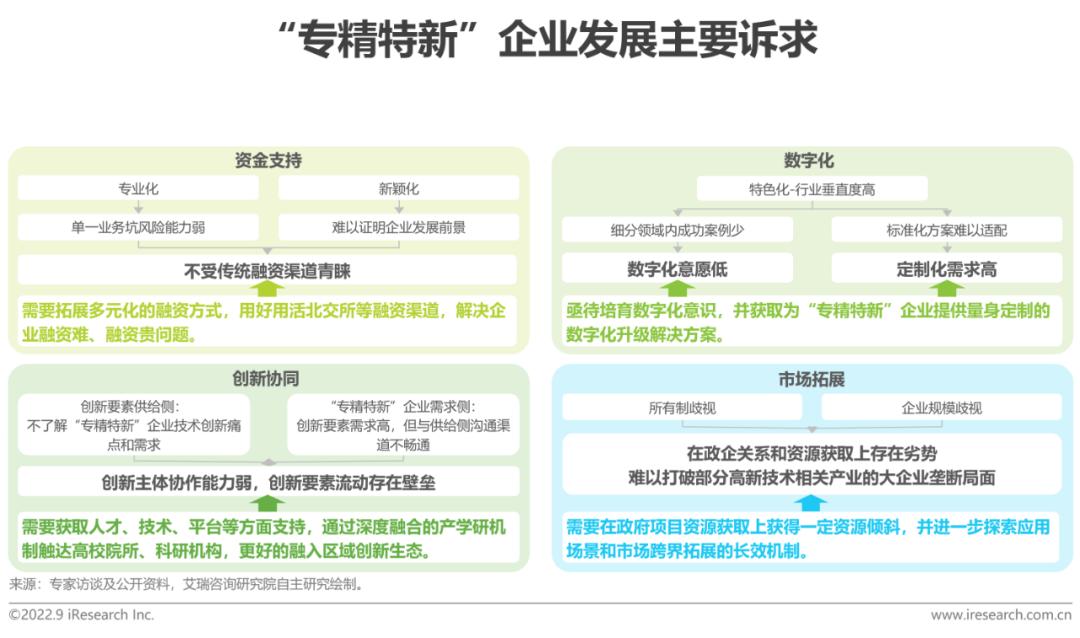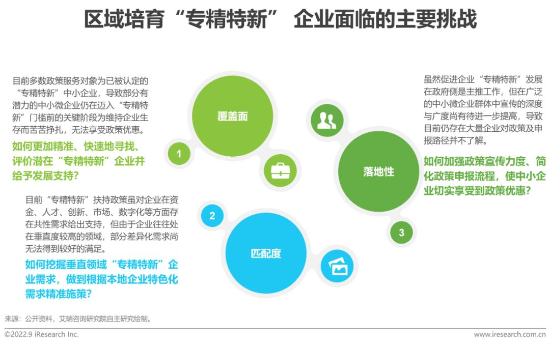 “专精特新”企业专业化、新颖化、特色化是其发展最大的特色亮点,但也为企业带来了资金、数字化、创新、市场等方面的问题需要政府侧支持。 资金方面,由于“专精特新”企业专业化、新颖化的特征,导致不受传统融资渠道青睐,融资难、融资贵的问题相较一般中小企业更加突出。数字化方面,由于“专精特新”企业行业垂直度高、专业性强,泛化的数字化解决方案往往不能满足其转型升级需求,需要了解细分领域的数字化厂商提供更加符合垂直行业特征的定制化解决方案。创新协同与市场拓展方面,由于“专精特新”企业在具有中小企业特性的同时,需要比一般中小企业更强的创新资源供给与更丰富的市场拓展机会,才可满足新颖化与精细化发展的要求,因此也面临更为严峻的创新协同与市场拓展难题。
