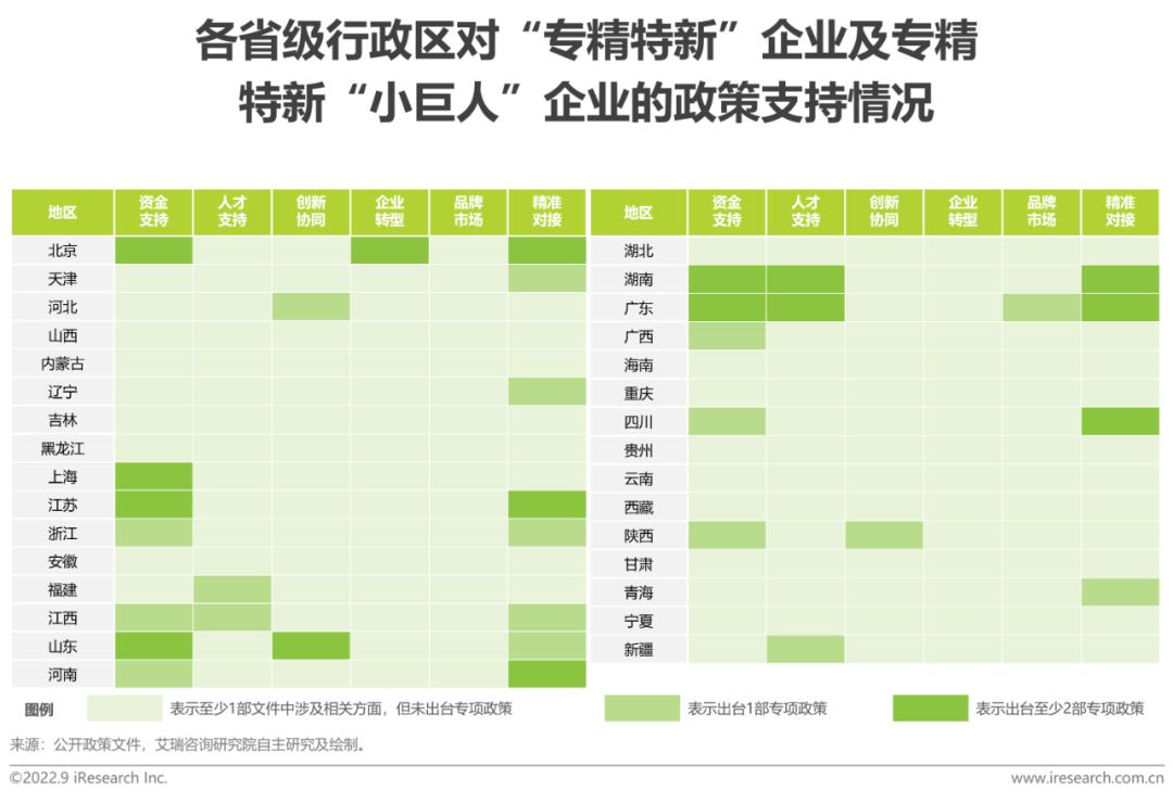 我国国家层面已经围绕资金支持、人才支持、创新协同、品牌市场、企业转型、精准对接服务等方面提出相应支持举措,各地方也纷纷出台政策文件支持企业“专精特新”发展。然而各地在培育“专精特新” 企业时,仍面临政策体系覆盖面较窄、落地性较弱、匹配度不高等问题,导致中小企业在“专精特新”发展过程中无法快速、便捷的获取所需要素支持。