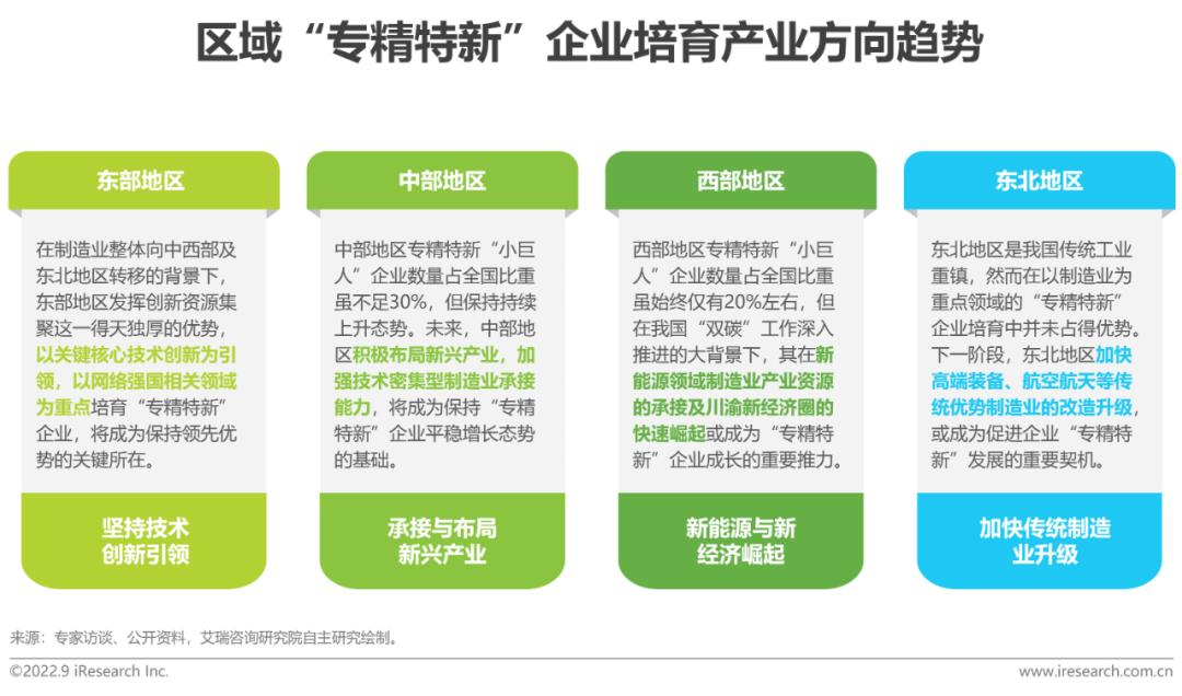当前,新冠疫情常态化发展、全球产业链供应链加速重构,我国加快推动产业在国内有序转移,以进一步提升区域发展的平衡性协调性、优化生产力空间布局、维护产业链供应链安全稳定。各地发挥比较优势承接产业转移,制造业整体向中西部下沉已成必然趋势。此背景下,各地区应聚焦不同产业发展路径培育“专精特新”企业,东部地区以强化关键核心技术创新为重点方向,中部地区以承接新兴产业布局和转移为重点方向,东北地区以加快传统优势产业改造升级为重点方向,西部地区以有序承接东部地区新能源产业转移为重点方向。