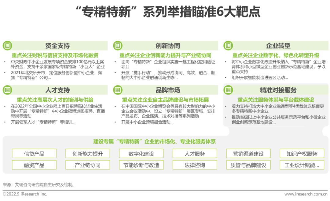 我国提出“十四五”期间,努力推动培育一百万家创新型中小企业、十万家“专精特新” 中小企业、 一万家专精特新“小巨人”企业的目标。国家层面密集推出多项与加强“专精特新”企业培育相关的举措,重点关注资金支持、人才支持、创新协同、品牌市场、企业转型、精准对接服务等6大方面。重点围绕专精特新中小企业全生命周期需求,引导各类市场化服务机构参与建设专属“专精特新”企业的服务体系。