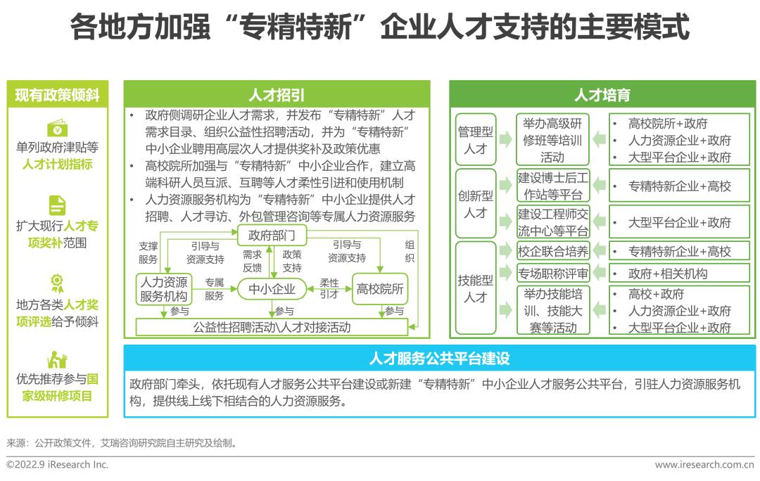 “专精特新”企业人才支持主要包括人才招引与培育两部分,相关工作推进过程中,在政府引导下,高校院所、人力资源服务机构、大型平台企业等主体均可参与其中,通过提供教师资源、学生资源、实习实训资源、专业服务、市场渠道等,为“专精特新”企业招才引智提供帮助。