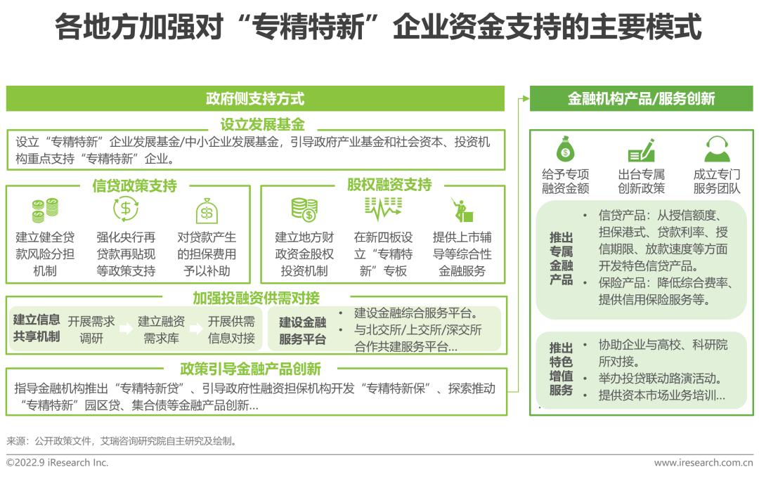 各地加强对“专精特新”企业资金支持的主体主要包括政府部门与金融机构两类。其中,政府部门支持方式多以设立发展基金、提供融资政策支持、加强供需对接与政策引导金融产品创新为主;金融机构则以推出专属信贷、保险产品及增值服务的形式提供支持。