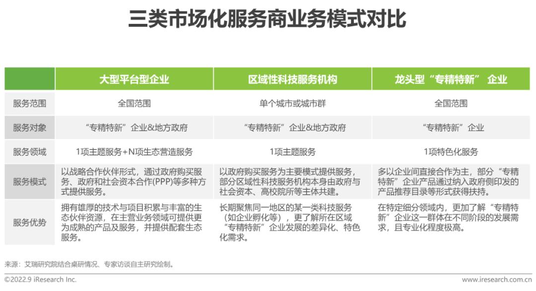 在“专精特新”企业服务生态中,除了各地政府在“专精特新”企业培育过程中发挥重要的主导作用,各种市场化服务商也发挥了重要的作用,并通常通过政企合作的方式,服务于“专精特新”企业。服务于“专精特新”企业的市场化主体根据商业化模式的不同,大致可以分为三类,包括:大型平台型企业、区域性科技服务机构、龙头型“专精特新”企业。其中,大型平台型企业由于掌握更多产业及创新资源,往往除主营业务外还可为当地政府与“专精特新”企业提供多项生态营造类服务;区域性科技服务机构通常深耕某特定城市或城市群,凭借自身对区域产业需求的深入了解,聚焦创业孵化等某一特定科技服务领域,提供具有区域特色的产品及服务;龙头型“专精特新”企业则往往借助自身在特定细分领域的专业化、特色化服务,帮助企业“专精特新”发展。