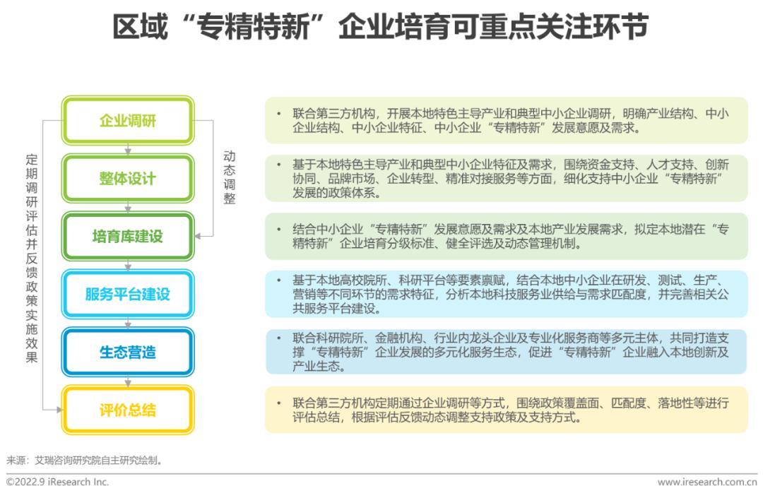 在“专精特新”企业培育方面,各地可从企业调研、整体设计、培育库建设、服务平台建设、生态营造、评价总结等环节入手,挖掘本地中小企业现状特征、发展潜力、发展诉求,有针对性的进行整体发展思路设计、完善梯度培育机制,并匹配要素供给所需公共服务平台,营造良好产业氛围。