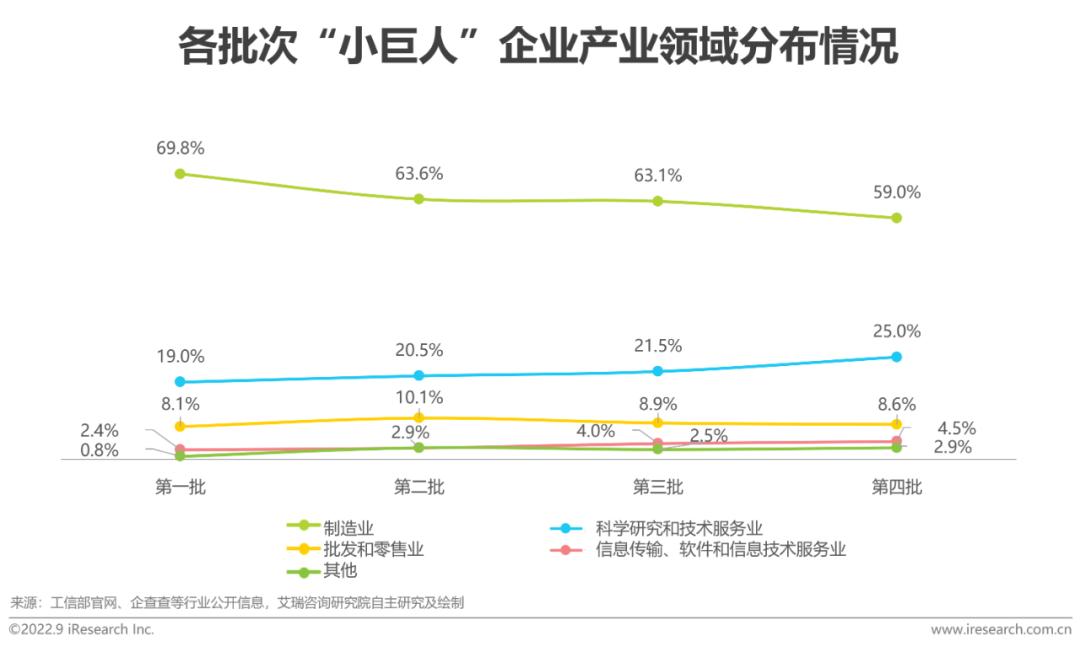 我国专精特新“小巨人”重点培育行业方向正逐渐从制造业向高技术服务业转移,特别是科学研究和技术服务业及信息传输、软件和信息技术服务业等行业发展态势如日方升。从行业领域来看,已公示的专精特新“小巨人”企业集中分布于制造业,占公示专精特新“小巨人”企业总数超六成。然而分批次来看,制造业专精特新“小巨人”企业数量呈现明显下降趋势,从第一批占比近70%下降至第四批占比不到60%。相比之下,科学研究和技术服务业及信息传输、软件和信息技术服务业虽目前占比较少仅为23%和4%,但分批次看则呈现出明显的上升趋势。