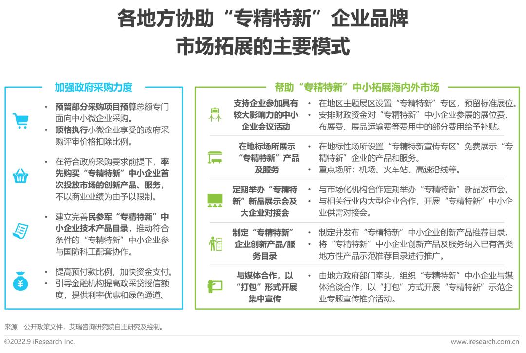 各地政府助力“专精特新”企业拓展品牌市场的方式主要包括两类,一是直接加强政府采购力度,扩大企业G端市场,二是通过举办展会展览、制定产品推荐目录等形式,加强对“专精特新”企业创新产品及服务宣传,从而助力企业拓展B端、C端市场。在市场宣传方面,政府部门通常会与大型企业、市场推广领域专业机构合作,以达到更好的宣传效果。