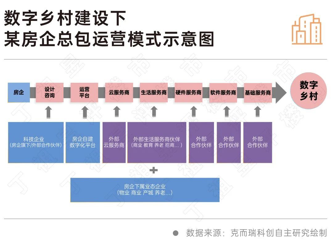以某TOP10房企为例,总包模式是拿地建设的模式,全部由房企整体负责。房企往往依托广泛的外部合作商以及旗下的各类平台企业进行资源整合,为乡村提供包括基础设施、数字化平台、线下到线上的政务服务、企业服务、商家服务、村民服务等,涉及到乡村改造、乡村开发的片区,房企也提供从设计、建设、管理到服务的一体化开发建设。这需要房企具有广阔的资源储备、专业能力和科技服务能力,科技公司对于数字乡村建设的诠释和理解成为打通数字乡村建设的关键。