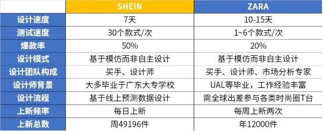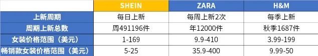 根据中泰证券数据,SHEIN产品设计速度在7天左右,测试速度约为每次30个款式;上新频率为每日上新,上新总数可达每周近5万件,也就意味着日均上新数量超7000件。相较之下,Zara产品设计流程需要经历参与全球各类时尚圈T台这一环节。因此,其产品设计速度在10-15天左右,测试速度约为每次1-6个款式;上新频率为每周上新两次,年上新总数为12000件,日均上新数量在30件上下。而H&M上新频率更为迟滞,采用每季上新方式,按秋季来算,每季上新数量约在1700件左右。