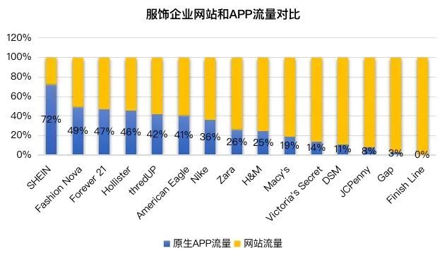 综合Similar Web、App Annie、谷歌和德勤分析的数据显示,来自原生APP的流量占据SHEIN线上总流量的72%。相较之下,Zara、H&M的APP流量占比分别仅有26%、25%。