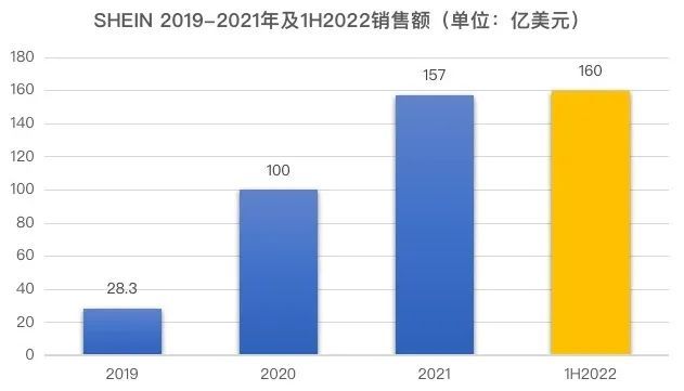 2021年,SHEIN销售额约为157亿美元。今年SHEIN设定的年度销售目标达300亿美元,上半年,SHEIN已实现销售额超160亿美元,同比增长超50%。