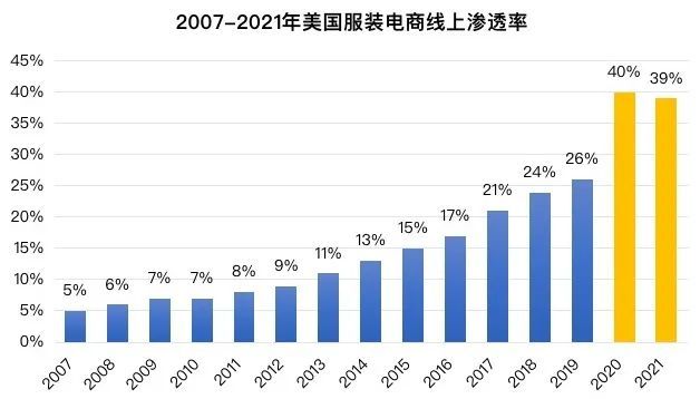 服饰消费也不例外。以美国为例,调研机构Euromonitor数据显示,美国服装电商线上渗透率从2019年26%提升至2020年的40%,并在2021年维持在39%的水平。