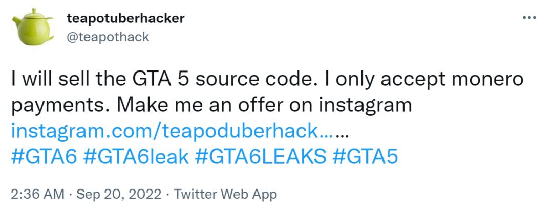 于是在20号和23号,黑客在推特发文称,他准备出售GTA5源码,并只接受门罗币付款。