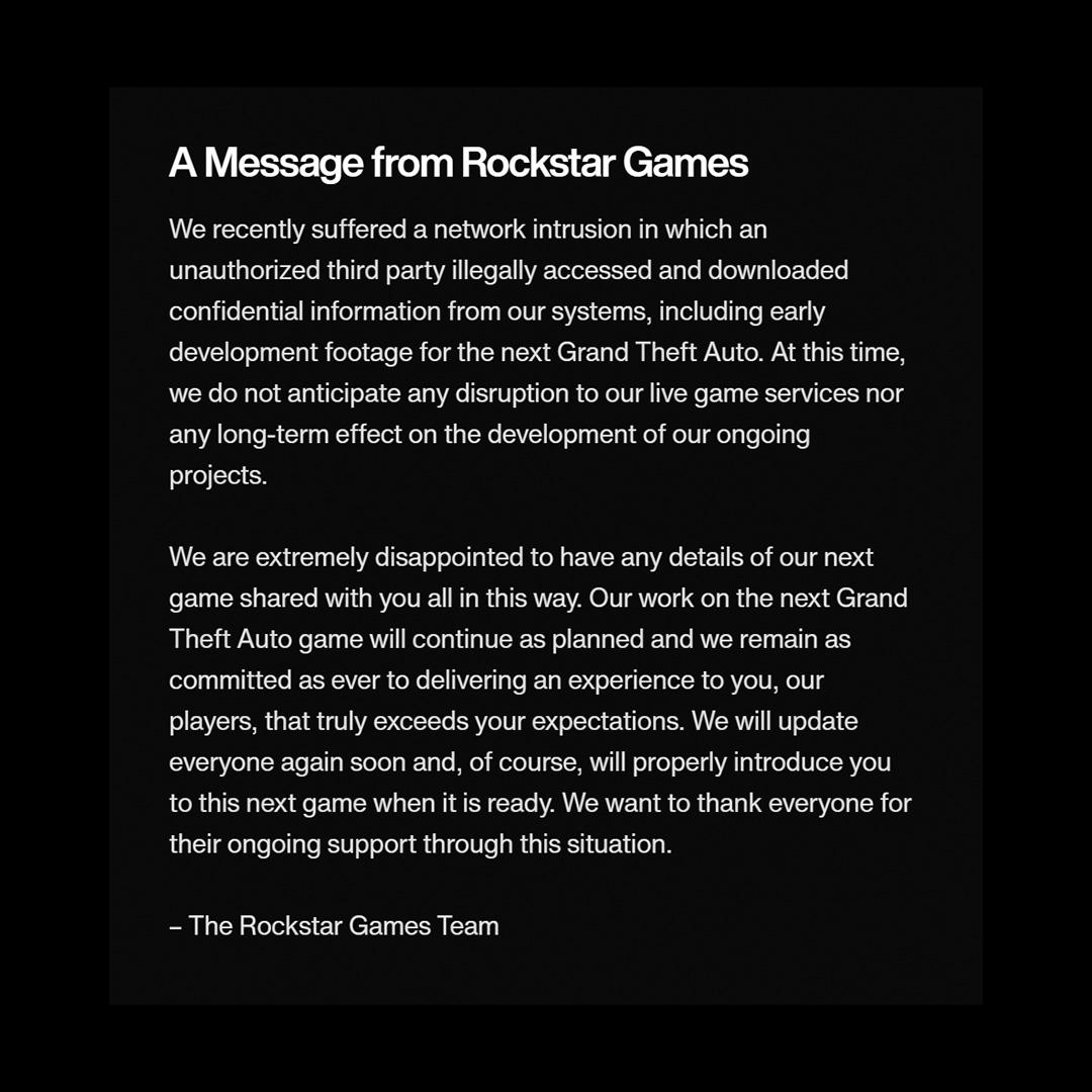 9月19日,R星也终于发布公告,承认了泄露内容的真实性,并指出此次泄露是由三方力量非法进入了内部系统,下载了机密信息。