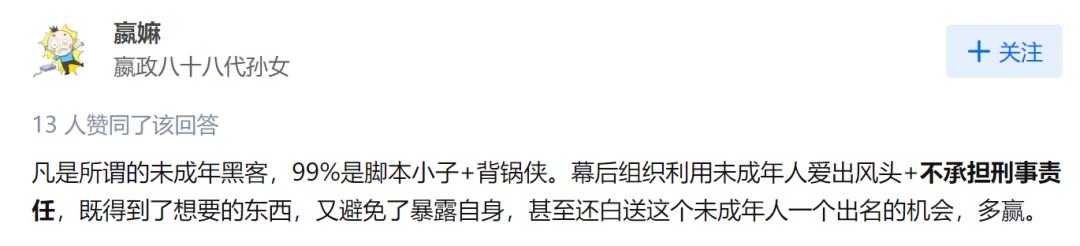 知乎网友@嬴嫲 说到,这些未成年黑客基本都是“脚本小子”和“背锅侠”,幕后组织利用未成年人爱出风头的劲儿,以及无需承担刑事责任的法律,不仅得到了想要的东西,还避免了暴露自身,甚至白送了未成年人出名的机会。