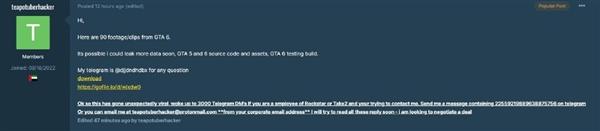 此前,这位泄露了GTA6内容的黑客在GTAForums更新了帖子,不仅直接放出自己的邮箱、Telegram,还向开发商Rockstar Games(R星)喊话,表示“期望达成一个交易”。