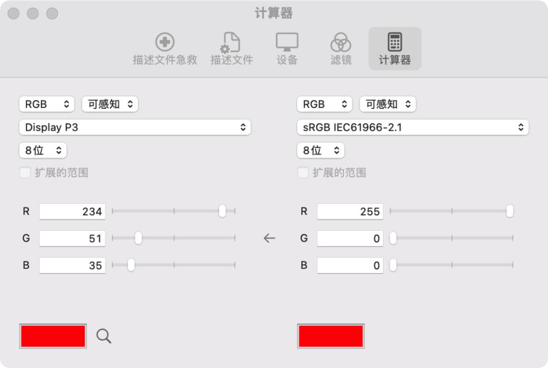 而因为 P3 色域是可以把 sRGB 完整包裹进去的,也就是说 sRGB 色域包含的每一个颜色在 P3 里都有唯一对应。比如说 sRGB 的纯红色是 sRGB 的 255,0,0,它等同于 P3 色域中的 234,51,35。