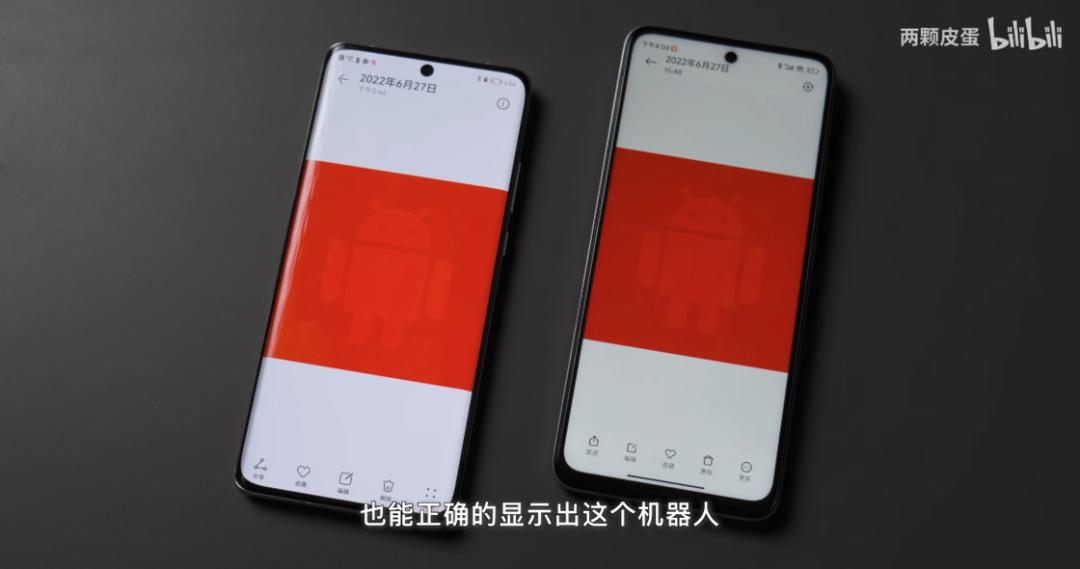 其次他们俩的标准模式,都做了色彩管理,UI 图标颜色正常没有过饱和,广色域照片可以正确映射。这是颜色显示最准确的模式,到这如果你理解了我前面说的映射逻辑,其实就能根据现象大致判断所有 Android 手机的策略,无非就是五种情况,高低饱和的纯色,都是在 sRGB 下作了色彩管理,区别是最后有没有拉到 P3,低饱和机器人,是 sRGB 下没做色彩管理,高饱和机器人,如果其他颜色也是对的,那就是是正确的映射,如果其他颜色过饱和,那就是没做色彩管理强制拉到 P3。