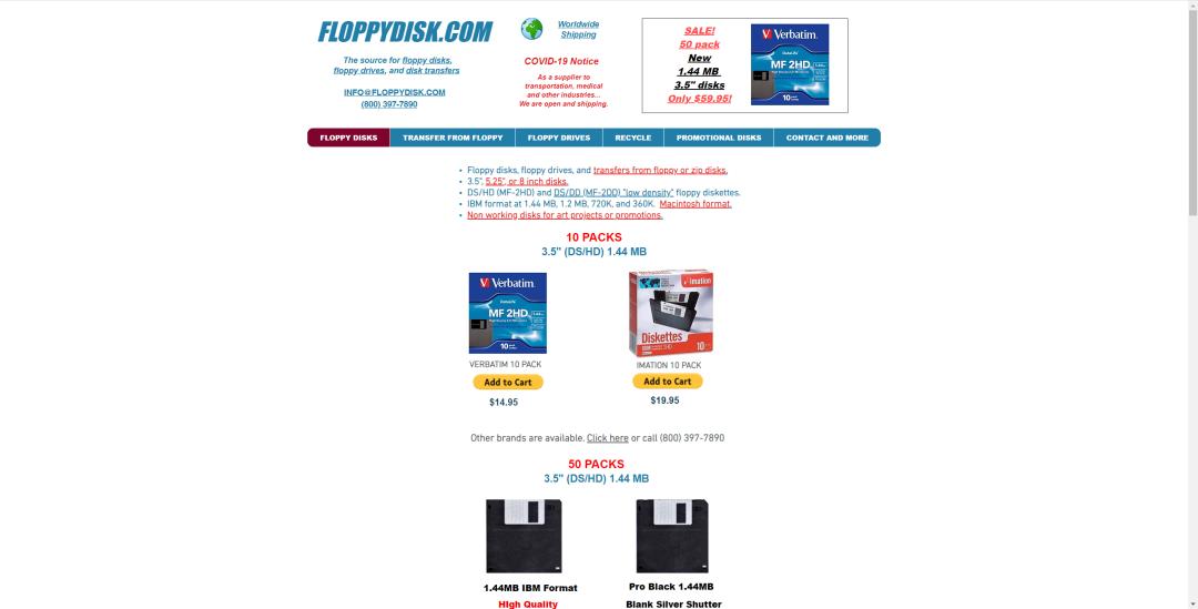 这个就是他的软盘网站 FLOPPYDISK.com ,界面也是非常的上世纪。全站也只有8 种产品,软盘的平均售价,都在 14 美元上下。