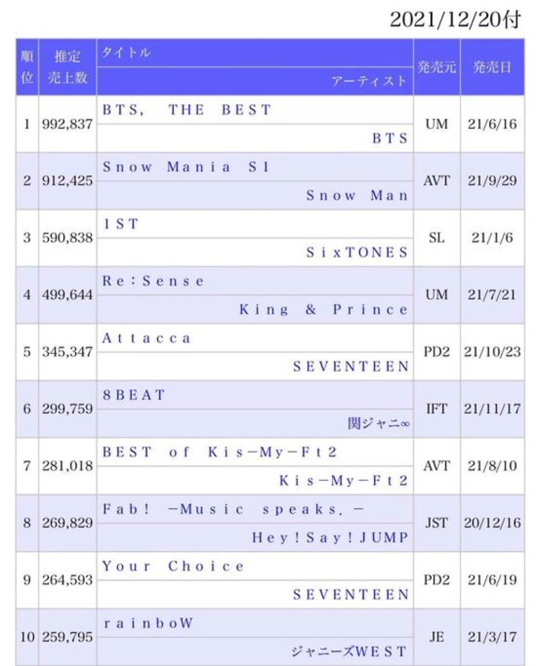 去年在日本最畅销的专辑是《BTS, The Best》,当年销量达到99万张。这是37 年来非日本艺人首次登上 Oricon 年度专辑销量榜首。上一次是迈克尔杰克逊的1984年的“Thriller”。男团Seventeen去年也有两张专辑进入Oricon的前10名。