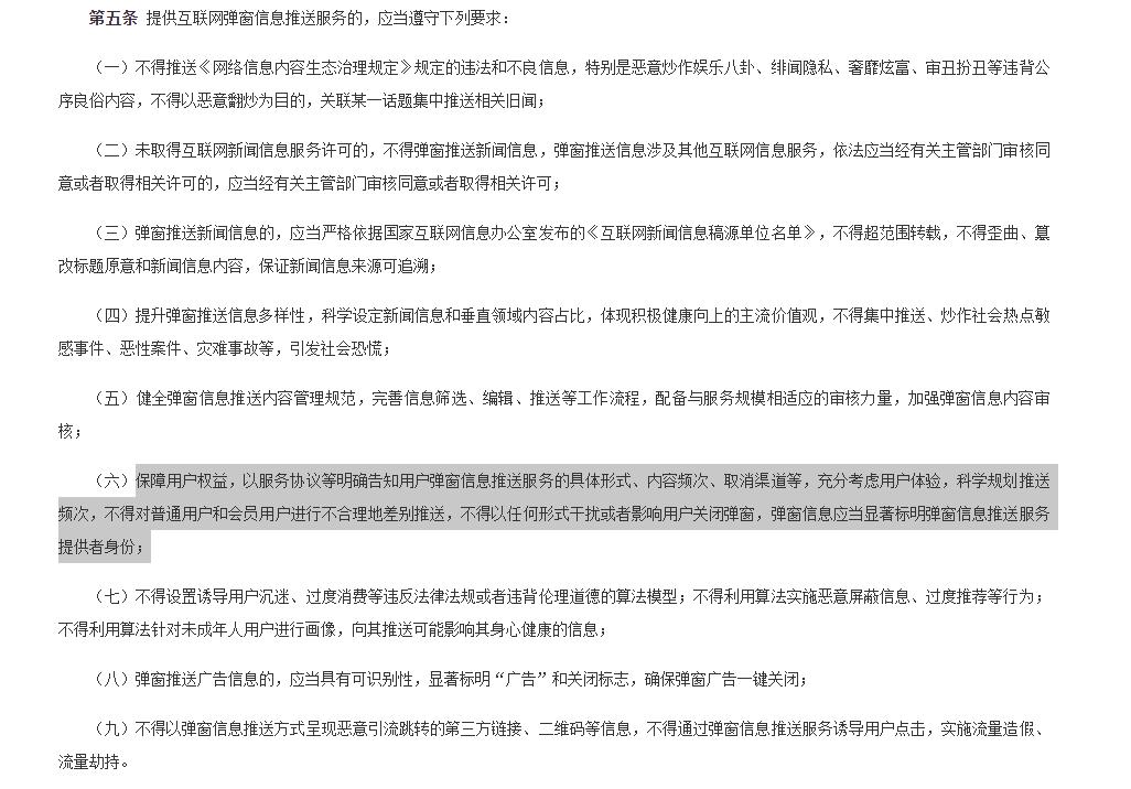 而据《互联网弹窗信息推送服务管理规定》(下称规定)第五条、第六项规定,提供互联网弹窗信息推送服务的,应保障用户权益,以服务协议等明确告知用户弹窗信息推送服务的具体形式、内容频次、取消渠道等。