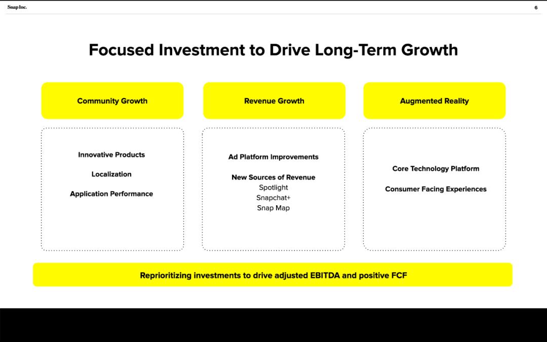 作为战略调整的一部分,Snap 宣布了公司重组后的三大核心发展方向,即保持用户增长势头,持续投资广告业务平台,以及建立和巩固在 AR 领域的领先地位。也就是说,Snap 未来的重点业务集中在社区增长、收入增长和 AR 。