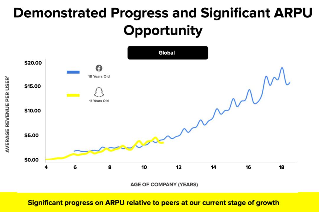 不过 Snapchat 在这三家公司中是最年轻的,目前发展阶段的 ARPU 水平其实和 Facebook 同时期相当,如果按照同样的发展趋势,Snapchat 的 ARPU 将在未来 7 年内增长为现在的四五倍左右。