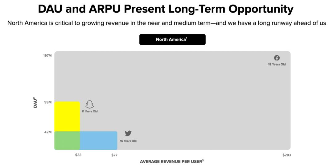 以北美市场为例,Facebook 有 1.97 亿日活用户,ARPU 为 283 美元,其日活是 Snapchat 的 2倍,但 ARPU 却是后者的 8.6 倍。