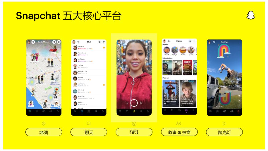 在“熟人+视觉交流”这一理念之上,Snapchat 中逐渐发展出五大核心功能:地图(Map)、聊天(Chat)、相机(Camera)、故事(Stories)和聚光灯(Spotlight)。