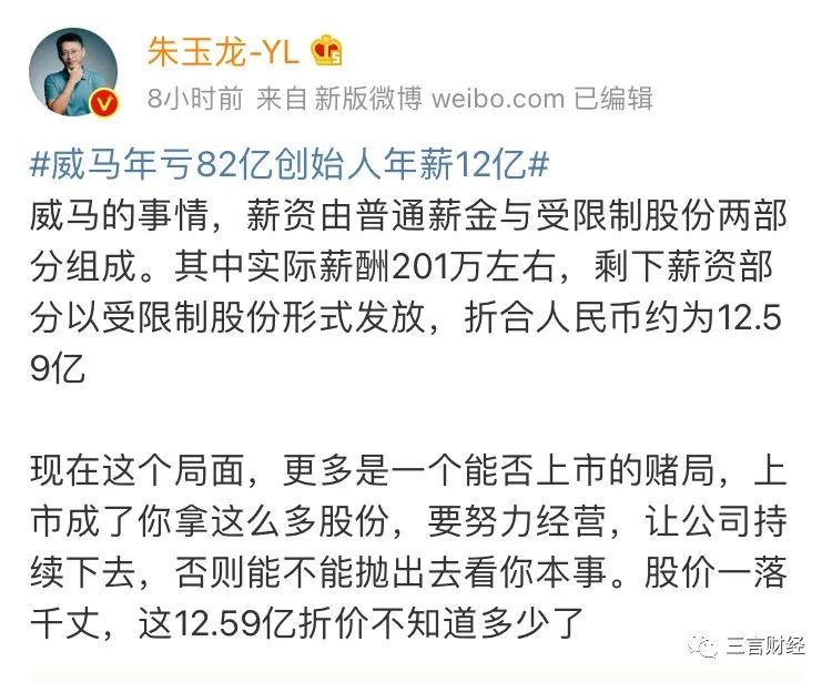 有很多博主同样发文解释了,只有威马成功上市,沈晖才能兑现这十多亿激励。还有分析称,即使威马成功上市,沈晖也不一定能真的拿到12亿。因为这要取决于威马经营表现,如果其股价一泻千里,照样可能什么也拿不到。