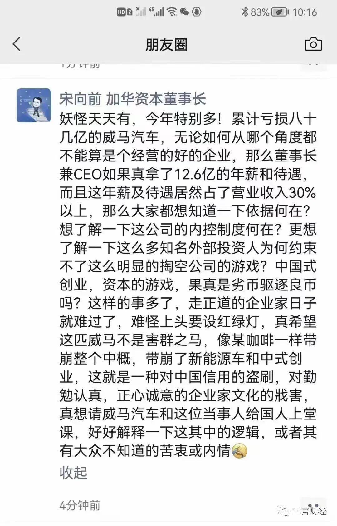 26日,加华资本董事长宋向前发文怒斥威马汽车累计亏损超过八十多亿,竟然公司董事长兼CEO拿了12.6亿元的天价年薪待遇,并且其个人收入占了公司营收的30%以上。