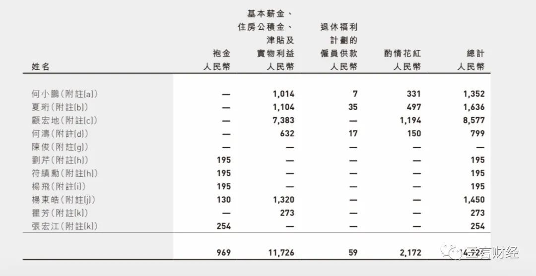 小鹏汽车财报显示,公司有9名董事8名高管,同样以袍金、基本工资、住房公积金、津贴及实物福利、退休福利计划雇主供款及酌情花红等方式支付薪酬。