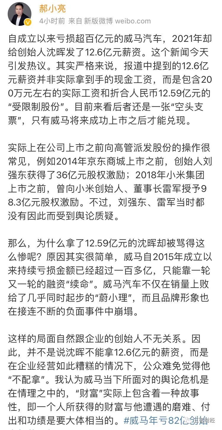 一石激起千层浪,“威马创始人年薪12亿”的说法迅速引发网友关注,相关话题阅读量超过三千五百多万。