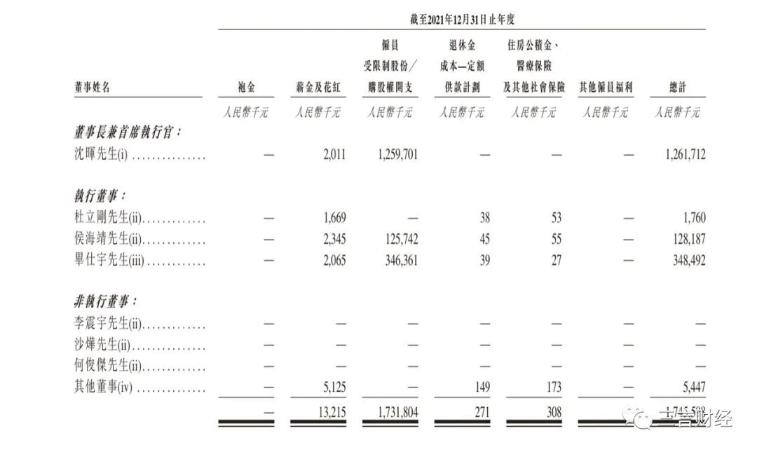 引发此次争议事件的则是威马汽车创始人沈晖的具体薪资。招股书显示,威马联合创始人兼执行副主席沈晖2021年总薪酬达到12.62亿元,其中包含薪金及花红201.1万元和限制股份或购股权开支12.60亿元。2021年,沈晖总薪酬占到董事薪酬的72.3%。