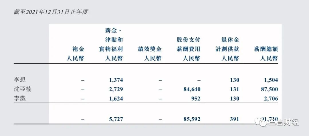 理想汽车财报显示,公司有董事8人、高管4人。以袍金、薪金、津贴及实物福利、绩效奖金、股份支付薪酬费用和退休金计划供款等方式支付。