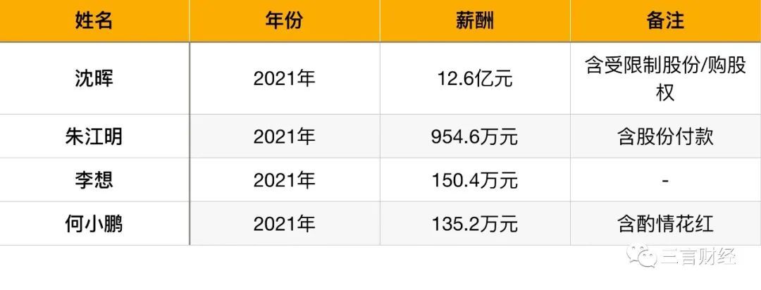 2021年,威马沈晖年薪12.6亿元;零跑朱江明954.6万元;李想150.4万元;何小鹏135.2万元。