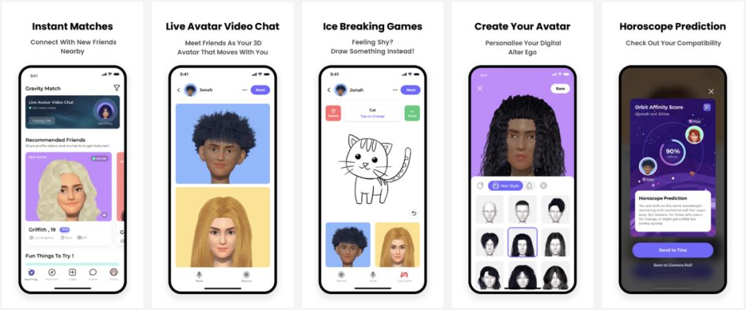 在注册账户时,Orbit 会要求用户填写性别、年龄等信息并选择符合自己的兴趣标签。当用户点击打开“Gravity”按钮时,系统将会根据用户填写内容为其匹配潜在合适用户。匹配成功时用户双方将以Avatar 的形象出现在聊天室,双方可以进行实时语音视频聊天。