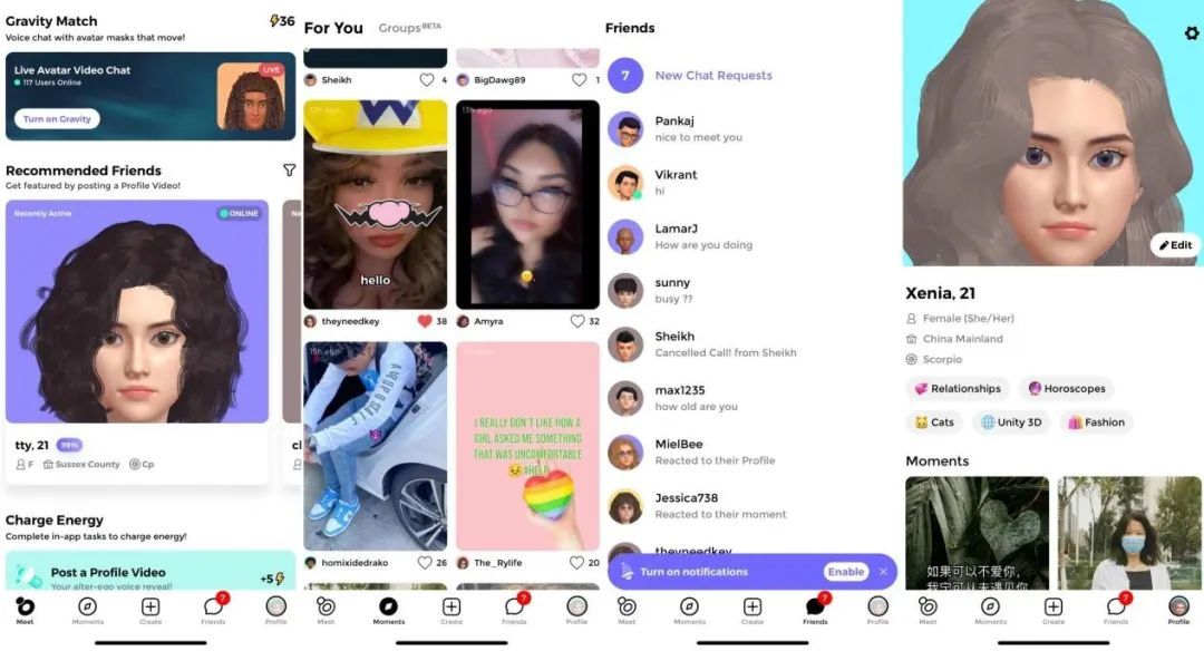 目前 Orbit 内设有 Meet、Moments、Create、Friends 以及 Profile 等 5 个 Tab,共提供随机视频匹配、信息流、群聊等 3 个交互场景。