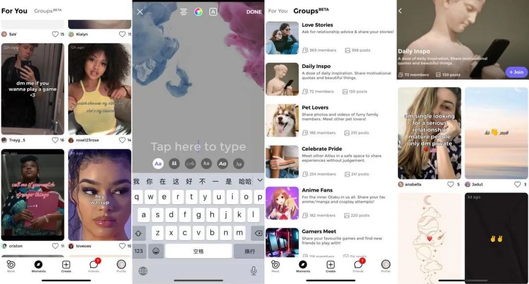 目前 Orbit 正在内测群聊功能,目前共有爱情故事、日常激励、宠物、少数群体、动漫爱好者、游戏玩家、搞笑故事、情绪角落、美丽文字等 9 个不同的群组,艺术、K-Pop、Rap、原创视频、Girls Only 等 5 个群组正在筹备中。