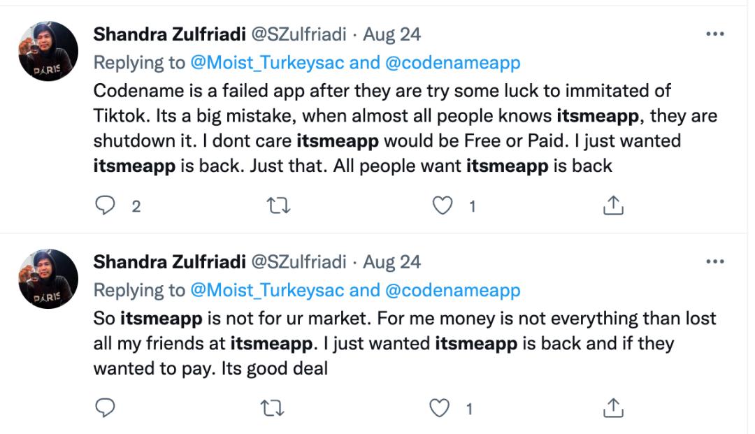 在宣布于 8 月 10 日关停后,曾经每天有将近 100 万分钟视频时长的 Itsme,在 App Store 和 Google Play 已经查无此 App,已经下载的应用已经无法打开、甚至就连 Twitter 账户内容也被全部清空,好像从没来过...