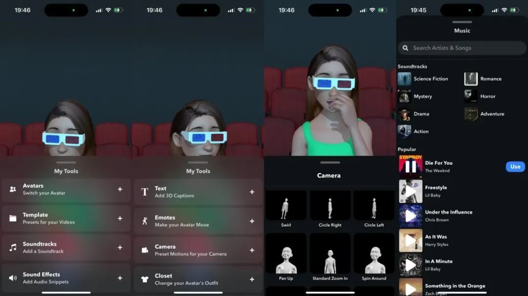 目前来看,除了基础的动态捕捉,在录制影片过程中,Codename 支持用户调整 Avatar 的角度和动作、运镜方式、切换 Avatar、编辑 Avatar 形象、切换背景、添加 3D 文字、保留原声、添加音乐、依照模板创作内容。我们选取其中有趣的几个功能,进行详细介绍。