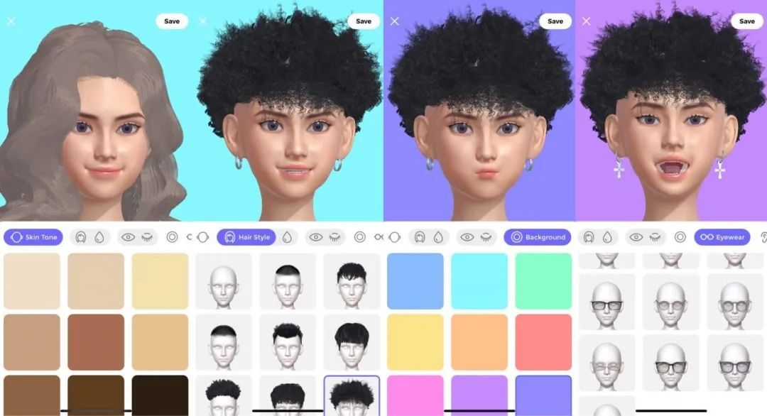 首先,当用户开放摄像头权限后,系统将通过主要捕捉用户眼睛、嘴巴和眉毛的形态生成初始 Avatar 形象,整体属于美式写实风,Avatar 表情会随用户表情实时变化。在这之后,用户可以跟自己的需求和偏好选择 Avatar 的肤色、发型、瞳孔颜色、睫毛、耳饰、眼镜以及背景颜色等,从而打造出更具个性化的虚拟形象。