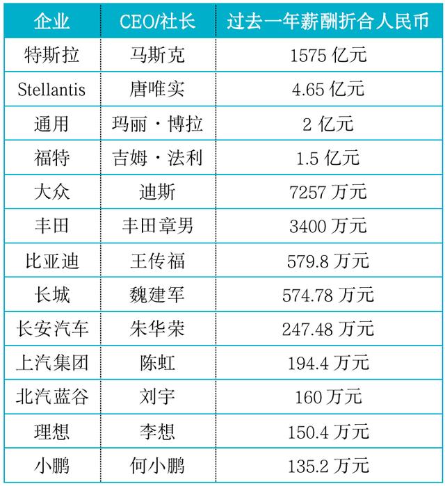 另据第一财经报道,若将范围进一步放大至全球的所有车企,过去一年特斯拉CEO马斯克以惊人的1575亿元的薪酬霸占榜首,同期比亚迪董事长王传福、长城汽车董事长魏建军、长安汽车董事长朱华荣的薪酬分别达到579.8万元、574.78万元、247.48万元,前述几家传统车企“一把手”的薪酬均高于理想汽车李想、小鹏汽车何小鹏的薪酬。