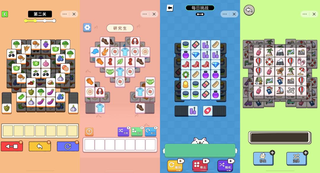 图注:从左到右依次为“牛了个牛”、“猪了个猪”、“喵了个喵”、“汪了个汪”小游戏界面。