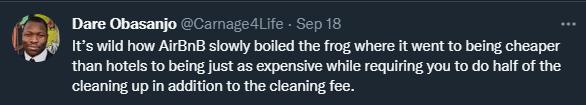 网友 Dare Obasanjo 表示,Airbnb 这套坑房客的做法,就像温水煮青蛙一样:一开始还比酒店便宜,然后变成一样贵,现在居然要房客做一大半的家政工作,同时还有脸收清洁费……