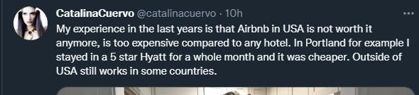 网友 CatAlinaCuervo 表示,自己的感受是 Airbnb 在美国已经完全不值了,价格甚至比酒店还贵。“我在波特兰一家5星酒店住了一个月,比 Airbnb 便宜多了。”