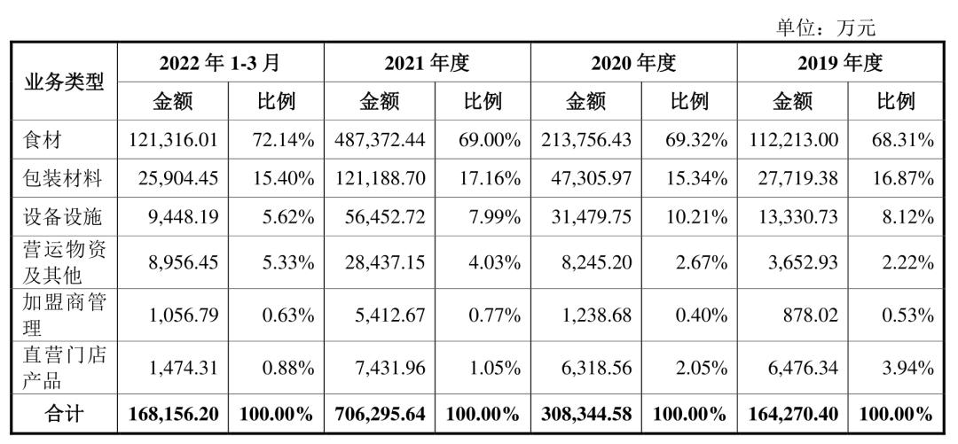 据招股书,为蜜雪冰城贡献营收的大头是食材和包装材料。品牌自己生产的奶茶粉、咖啡粉、饮料浓浆、果酱等食材占比约70%,塑料杯、吸管、手提袋等包装材料占比超15%。