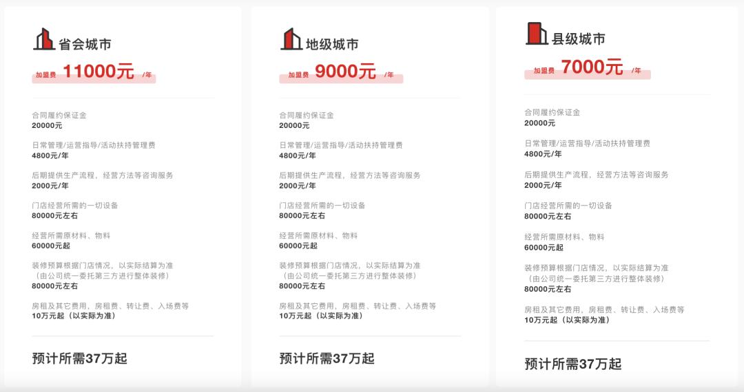 蜜雪冰城官网显示,每年的加盟费用为省会城市11000元,地级市9000元,县级市7000元。按照餐饮行业的普遍行情,蜜雪冰城的加盟费不算高。但算上设备费用、装修费用、原料费用和转让费、门店租金等,一家门店的前期启动资金需要37万元。